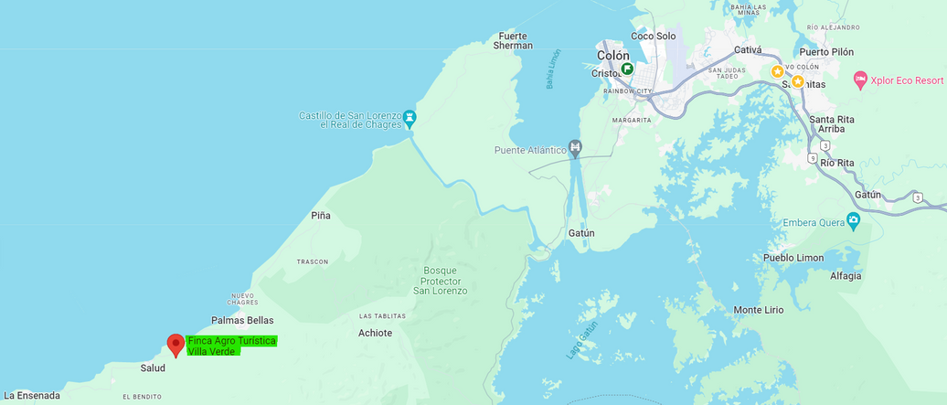 La Finca Agroturística Villa Verde esta ubicada en Los Camarones, Corregimiento de Salud, Distrito de Chagres, Provincia de Colón, (Panamá).